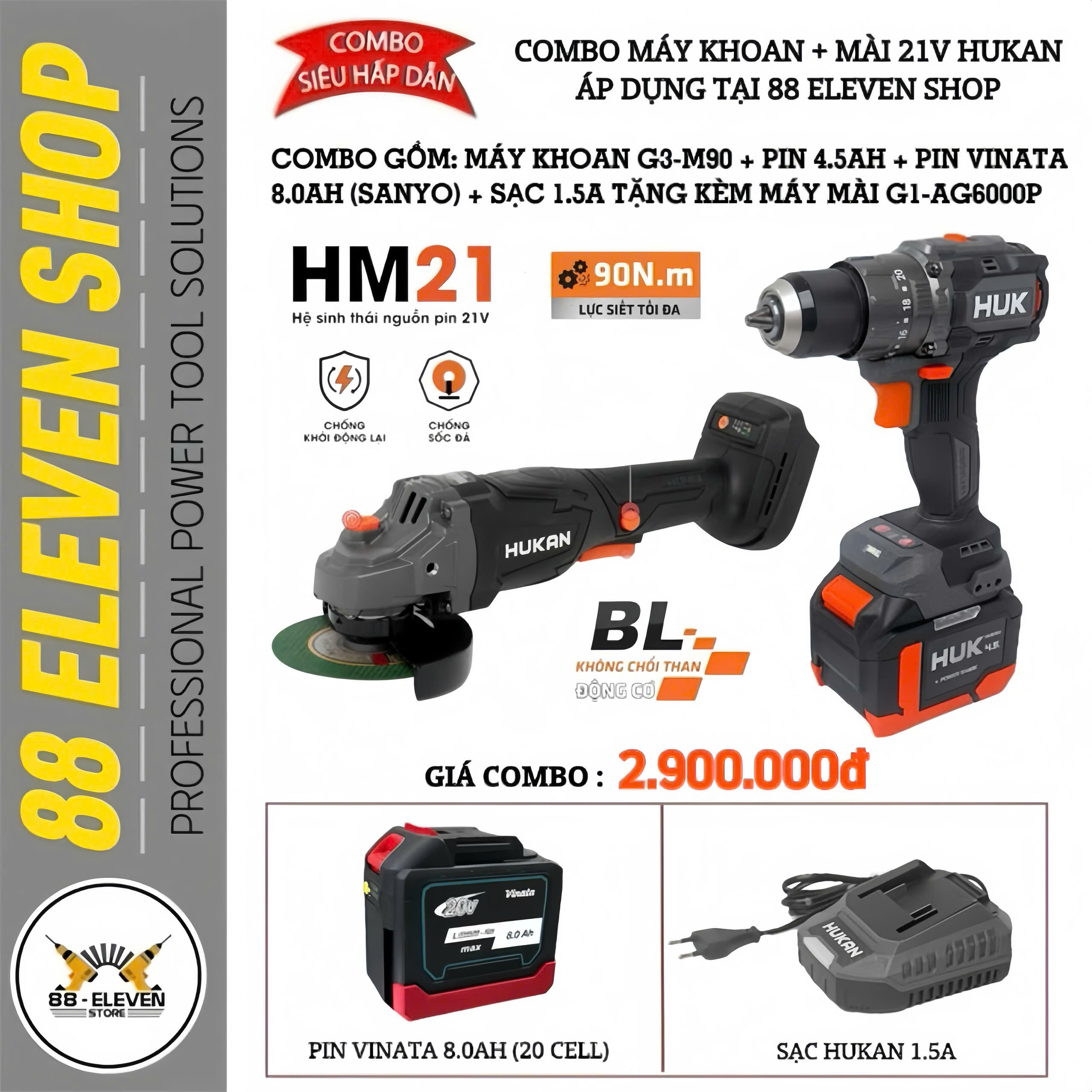 (Tặng Máy Mài) Combo Máy Khoan 3 Chức Năng 21V Hukan G3-M90